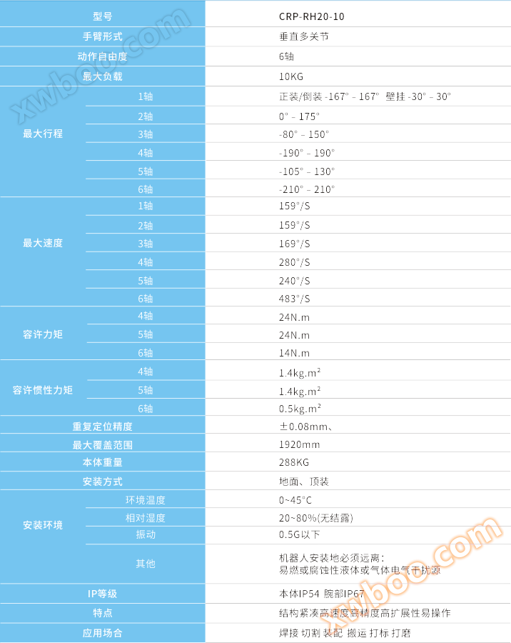 · 工作空间大、运行速度快、重复定位精度高,适用于焊接、喷涂、上下料、搬运、分拣、装配等应用,适用范围广。